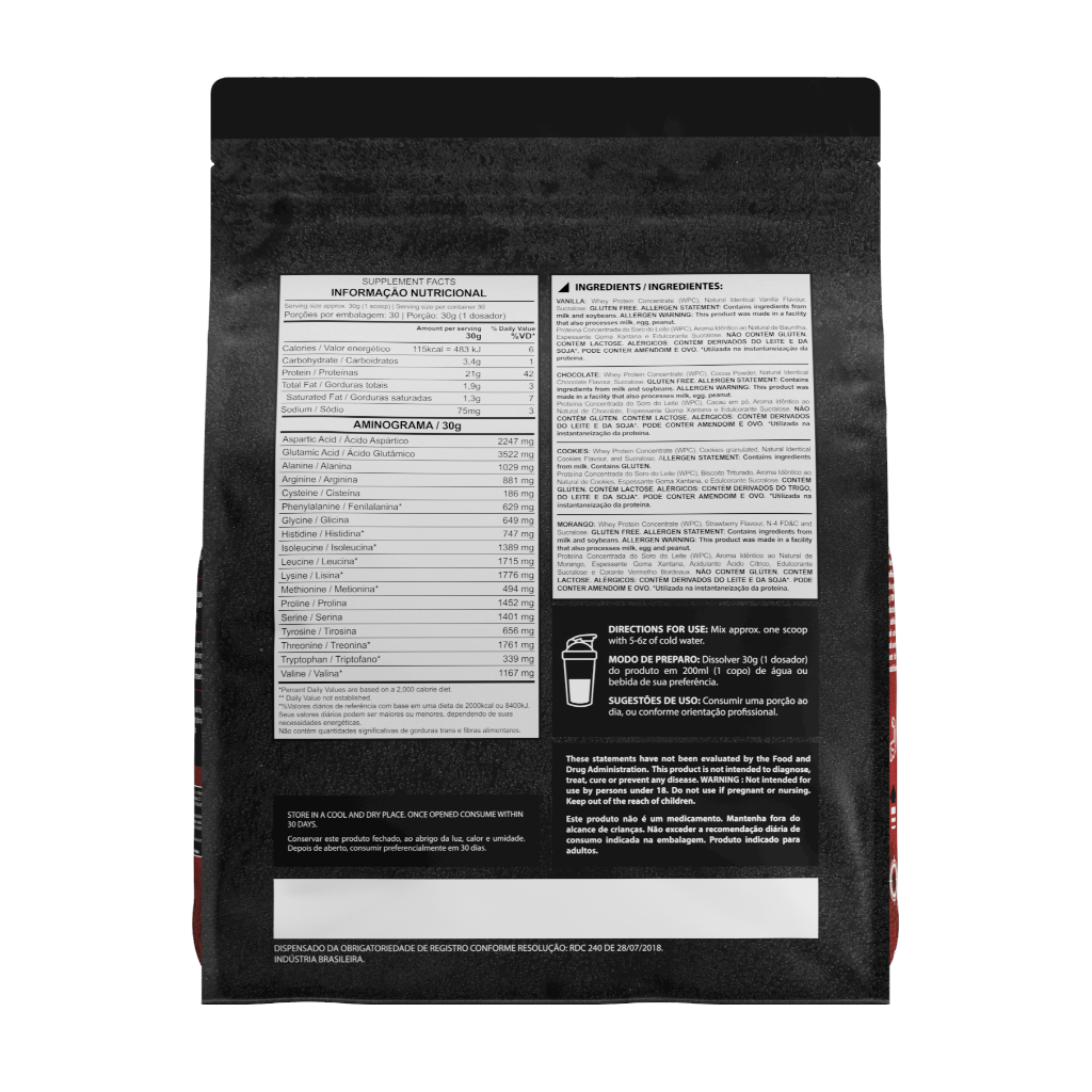 Com 21g de proteína por dose, esse whey é formulado a partir da proteína concentrada do soro do leite (WPC), oferecendo excelente perfil de aminoácidos, incluindo 8,6g de aminoácidos essenciais e 4,2g de BCAA, fundamentais para a reconstrução muscular após o treino.