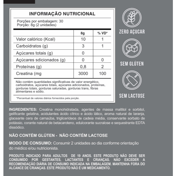 2 gummies ao dia fornecem a dose ideal de 3g de creatina.