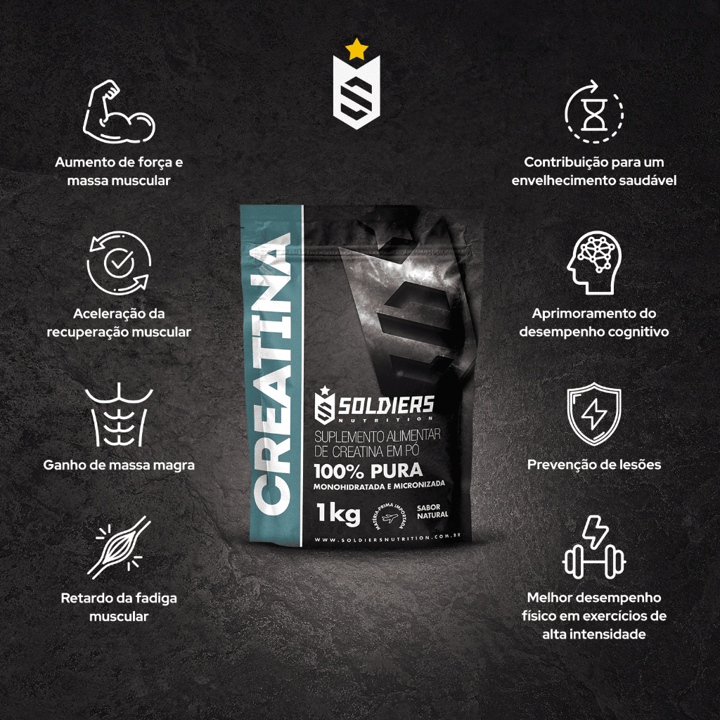 A Creatina Monohidratada 100% Pura Importada Soldiers Nutrition 1kg é um suplemento de alta qualidade, desenvolvido para atletas e praticantes de atividades físicas que buscam mais força, potência e desempenho muscular.