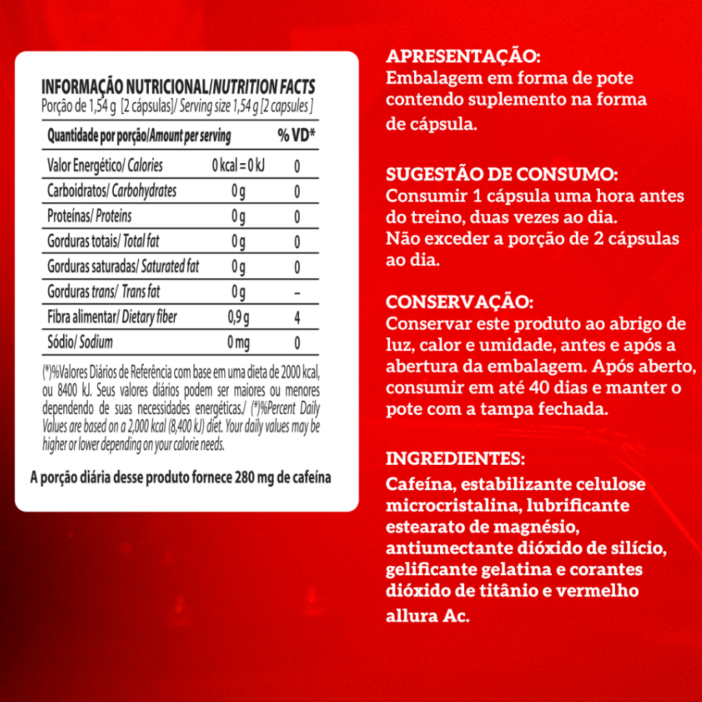 Sua fórmula contém 100% cafeína, proporcionando estímulo direto para performance.