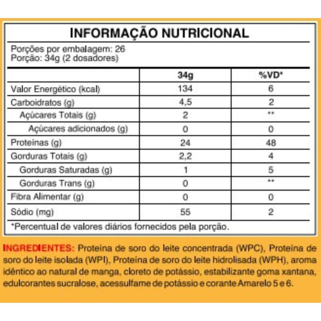 Proteína concentrada do soro do leite (WPC), proteína isolada (WPI), proteína hidrolisada (WPH), aromatizante natural, cloreto de potássio, goma xantana, sucralose e acessulfame de potássio.